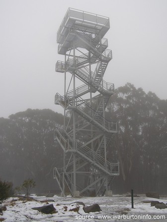 Picture of the tower on Mount Donna Buang. (Photographer: Paul Jackson) Snow on the ground in August 2012. When very icy, the tower can be closed by Parks VIC for safety. But it is usually open. On fine summer days you can see for many miles - it's an awesome experience and one that yours truly took 3 years and several attempts before finally making it to the top. :)